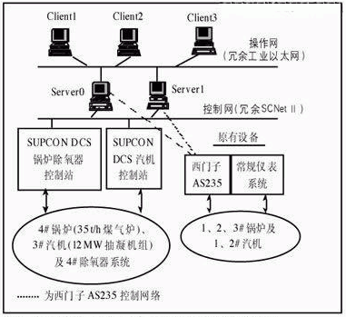 某钢铁集团热电厂原有3台35t/h煤—煤气混烧链条炉、1台3MW背压汽轮发电机组、1台6MW抽凝汽轮发电机组,采用常规仪表和西门子AS235 DCS (1:1冗余配置)。由于AS235系统未配备上位监控软、硬件,因而无法实现对生产过程的监控。