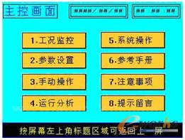 从主控画面可选择进入各控制及运行画面等。在主画面上,可以看到各处操作画面以及监控画面等。