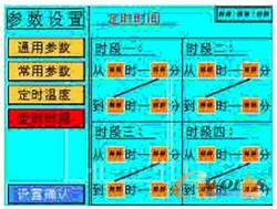 参数设置主要分为通用参数,常用参数,定时温度以及定时时段几个画面。通过这几个参数设置画面,可把各个时间段的温度以及每个时间段的轮换时间传送到PLC自动控制各个时间段的温度变化。下图为定时时段参数设置画面: