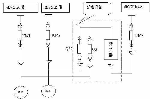 图中 M甲、M乙为两台凝结水泵,KM1、KM2两台凝泵电机工频电源开关,KM3为凝泵电机变频电源开关,QS1、QS2为两台凝泵变频输出开关。