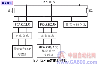 系统选用32位SoC硬件平台如Dragon ball核心的MC68EZ328取代原来的16位ABS控制器,提高了硬件处理速度与抗干扰能力,端口资源也更丰富。车载雷达选用法国AutoCruise公司生产的AC10型77GHz毫米波车载雷达,雷达信号的处理采用DSP处理器,并通过CAN总线与ABS/ASR/ACC集成系统控制器进行通信。CAN总线传输具有数据差动收发、容错和非破坏性仲裁的能力,传输速率高达1 Mbps。采用CAN通信提高了控制系统的实时性[6>,并为系统功能扩展和整车传感器信息共享提供了方便。CAN通信拓扑结构如图3所示。
