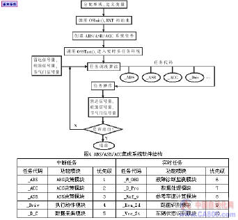 汽车ABS/ASR/ACC系统软件集成化的难点是:在保证控制实时性的前提下如何进行中断管理和协调各项任务的优先级,因此在该系统中引入嵌入式实时操作系统十分必要。实时操作系统能合理分配软、硬件资源,实时进行多任务并行处理,为系统进行HAC(坡起辅助系统)与EBD(电子制动力分配系统)等功能扩展提供了条件,同时支持多线程的软件结构,增强了软件抗干扰性。操作系统选用VxWorks,任务调度采用基于优先级的抢占式策略。ABS/ASR/ACC集成系统中的任务优先级分配策略如表1所示。基于操作系统和任务优先级设定,具体的ABS、ASR和ACC控制功能由API调用应用程序实现。集成系统软件结构如图4所示。