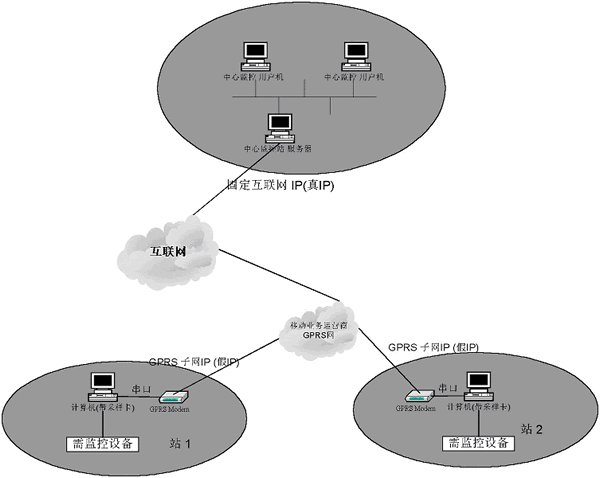 客户端:普通pc+GPRS Modem,拨号上GPRS网络。