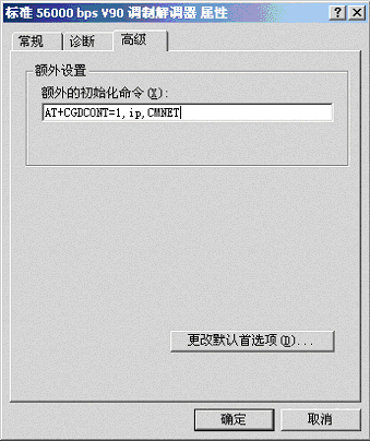 控制面板—>电话和调制解调器选项—>调制解调器—>属性—>常规—>串口1—>最高速率(57600)—>高级—>额外的初始化命令: