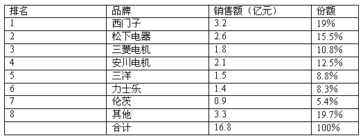 据统计, 2005年度中国内地的交流伺服运动控制产品的市场容量已经达到了16.8亿元人民币。现根据市场品牌占有率从高到低排列