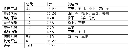 交流伺服运动控制产品的应用主要以机械配套为主,主要涉及机床工具、食品包装、纺织印染、电子制造、塑料机械、印刷造纸、橡胶机械等,具体的市场份额比例如表2所示。