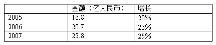 在未来2年内,交流伺服运动控制产品的市场规模如表3所示。2006年和2007年它将保持23%和25%的增长率,并将站稳20亿人民币的市场规模。