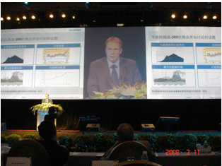 随后,国家发改委和改革委员会能源研究所副所长、可再生能源学会副理事长李俊峰先生就“气候变化孕育的商机——低碳经济和可再生能源发表演讲,他指出现代化的生活是以能源消耗为牺牲的,中国的减排压力已经日渐加大,我们的机遇在于,对能源消耗的限制可能开启中国能源变革的时代。中国的能源问题主要来自我国的能源困惑和压力,中国存在长期的能源短缺问题,我们的经济发展是以能源的消耗为支撑的。全球新增的能源消费50%来自于中国,全球新增的温室气体大约一半来自于中国,因此所有的减排压力直指中国。然而压力可以转化为机遇,它可以进一步推进我国可持续发展战略的实施,有利于促进先进和节能技术的发展,而且可再生能源的发展是我国目前大力倡导的。李俊峰先生在演讲中说:“中国的可再生能源领域是世界上最大的潜在市场。中国需要技术创新,需要西门子这样具有高度创新力的公司,可以预期,西门子一定会为中国的低碳经济做出突出贡献!”
