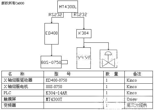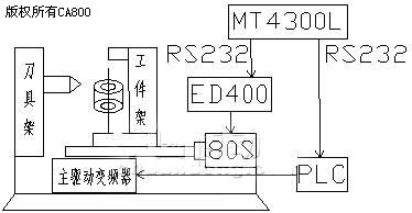 由触摸屏作为主站,通过RS232与PLC通讯控制,实现各种工件参数的设定,同时通过触摸屏独立的双串口协议功能与伺服通讯,完成对X轴径向进给运动控制。