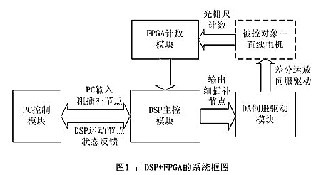 高速直线电机是本系统的控制对象,它具有加速快(a>10g),运动速度高(v>300mm/s)的特点。要求控制系统有足够短的响应时间(<100ns)和足够高的定位精度(10nm级),因而系统的核心CPU的处理能力及运算能力必须满足高速要求;此外,直线电机运动定位的核心是高精度的反馈控制装置。直线电机的反馈控制装置是光栅尺和高精度脉冲计数器,光栅尺发出与运动距离成线性关系的脉冲数,脉冲计数器的计数值表示直线电机当前的运动位置。经计算,计数长度为28位的计数器才能满足定位的精度要求,同时计数频率很高。一般的通用计数器参数无法达到,所以设计一个特殊计数器是必要的。为了方便设置目标点的运动参数,使运动控制卡具有比较好的人机交互功能,系统必须具有与PC机通信的功能。