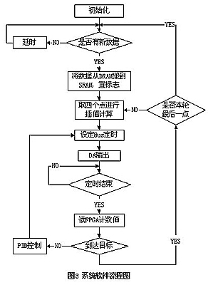 运动控制算法的核心是先用B样条插值法把目标点进一步细化,使运动曲线更平滑,然后在运动过程中采用PID算法进行调整,最终达到高速高精的设计要求,图3给出了系统软件流程图。