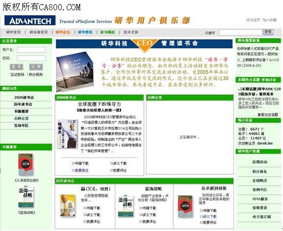 研华,7月 9日,2008 – 本月7日,研华用户俱乐部全新推出读书频道,旨在延续研华CEO管理读书会品牌活动。研华用户俱乐部读书频道(以下简称“读书频道”)是由研华CEO管理读书会延伸而来,由最初内部员工活动扩展到研华与客户、合作伙伴等外界交流,致力于为广大用户快捷、翔实、提供研华CEO管理读书会的相关信息,突破传统“读书”概念,以网络形式与更多人分享读书心得与管理经验,增进研华与用户、用户与用户之间的互动交流,传达研华“读书·学习·分享”的理念。