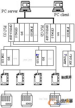 由于系统比较复杂,控制采取分层控制策略,由两台上位机完成工厂级的监控及数据管理功能,触摸屏和PLC完成现场级的控制,采用Profibus现场总线的方式进行通讯。上位机留有接口,可连接局域网和广域网,以利于进一步的开发。其中数字输入点有900多点,数字输出有400多点,模拟量输入20个。