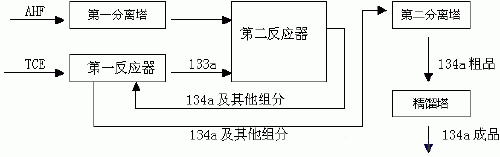 HFC-134a是由无水氟化氢(AHF)和三氯乙烯(TCE)在经过两步化学反应生成的产物。第一步是由AHF和TCE反应生产HFC-133a; 第二步是由HFC-133a和AHF反应生产HFC-134a。