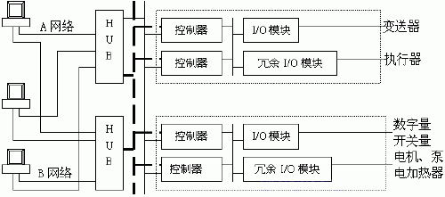 Harmonas系统的上位机由两台操作站,一台工程师站构成,一台打印机组成。下位机由两个控制柜及相应的I/O模块构成。系统在控制器、重要的AO/AI(模拟量输入/输出)模块及系统通讯方面采用冗余技术,大大提高了系统的安全性。系统框图如下: