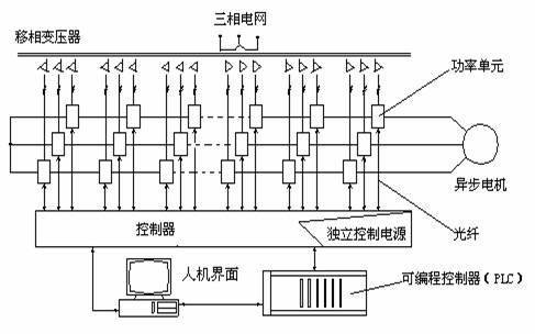 JD-BP37 型高压提升变频调速器采用新型 IGBT 为主控器件,全数字化,彩色液晶触摸屏控制,以高可靠性、易操作、高性能为设计目标,采用先进的矢量控制变频调速技术完成提升机的四象限运行,用于鼠笼式电机或绕线式转子串电阻电机控制,即可用于新矿井安装,也可用于老矿井改造。风光高压提升变频器,采用若干个低压逆变器功率单元串联的方式实现直接高压输出,所用的 6kv 高压提升变频器,变压器有 18 组付边绕组 ,每相 分为 6 个功率单元 ,三相共 18个单元, 采用 36 脉冲整流,输入端的谐波成分远低于国标规定。高压提升变频器系统结构图如下图 1 示 . 。功率单元电路结构 2示。