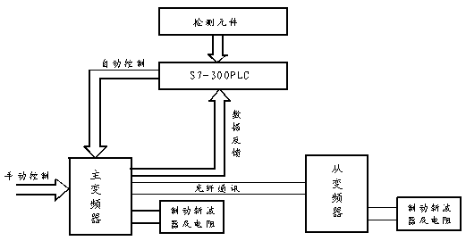 系统使用ABB的两台变频器,采用主从传动,DTC(直接转矩控制方式)控制方式,主变频器与其从变频器之间采用光纤通讯,所有来自外部的数字、模拟输入只进入主变频器,主变频器接到外部指令后,其从变频器立即作出与主变频器一致的启动、运行、速度、力矩、电气制动等紧紧跟随。该系统的速度监视功能使电气制动到零速时快速实现机械制动,转矩监视功能不但保护了变频器,还为系统确定了铁牛撞上重车并拽稳重车后使铁牛自动牵引车皮往液压平台方向运行的信号。主从传动方式中的速度、力矩控制使系统实现了两台到多台电机的速度、力矩的平均分配,DTC控制使变频器实现了对电机的精确的力矩控制,电气制动加机械制动满足了系统的快停和准确定位要求。手动加自动控制系统确保了系统的高效连续可靠运行。
