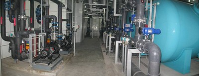 “水立方”中游泳池的水质是按照现行FINA标准设计的,该系统采用“石英砂过滤器+全流量臭氧消毒系统+活性炭吸附”的逆流式池水循环处理工艺,具体流程如下:游泳池水面的溢流,会经过周圈的溢流沟回到均衡水箱,水经毛发收集器去除毛发及大颗粒物质后,由循环水泵加压,经过絮凝剂投加并充分反应后,进入石英砂过滤器,去除悬浮物、色度。过滤出水进行臭氧氧化消毒,经反应罐后进入活性炭罐,滤后水进入换热单元,采用分流加热,经过板式换热器的水与未被加热的水充分混合,池水在线采水管处设温度监测点,用于调节热媒量,从而达到控制水温的目的。