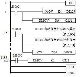 采用M测速法,以固定时间中断(不受PLC程序扫描时间的影响)的方式测算主轴速度,即由每0.4秒光电码盘的计数脉冲值测算出主轴速度。如程序2所示。