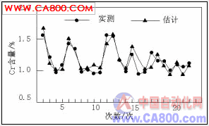 通过上述的数据滤波和标准化处理,最终得到104组数据x(104×13),且:x=[x1,x2, …x13>主元分析法中的降维方法很多,此处是利用对载荷矩阵的分析:即从第一主元所对应的特征向量中选取绝对值最大的系数所对应的变量,然后将此变量从数据集中剔除,再继续用主元分析法分析剩余的数据集合,用同样的判据选择第二个变量。重复此过程。最终,这组过程变量对钢水中Cr含量的影响程度,由大到小依次为:采样一Cr%、Alloy装入量、采样二Cr%、采样二钢水温度、加电到采样一时间间隔、炉内余留Cr%、初始Cr%、 Solids装入量、Turnings装入量、Mixed scrap装入量、采样一钢水温度、General装入量、采样一到采样二时间间隔( x10,x1,x13,x12,x8,x7,x6,x2,x3,x5,x9,x4,x11)。