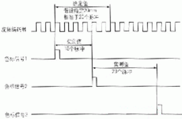 根据旋转编码器原理可知,其线数越多,即印版每转一周所产生的脉冲数越多,位置精度越高。假定印版周长为500mm,编码器的线数为500线,则500mm对应500个脉冲,1mm对应1个脉冲,20mm对应20个脉冲.