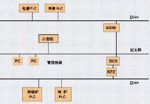 由网络图可以看出,全厂的PLC共构成两条数据高速通道(DH+)链,一条是电解、净液的PLC通过ROCKWELL公司的以太网接口模块5/20E与以太网相连,一条是阳极精炼炉、转炉的PLC通过DCS与上位以太网相连。采用这种联结方案主要是受各PLC物理位置的限制。PLC的实时数据传到以太网后,由美国DEC公司的阿尔法小型计算机接受并转换成个人电脑可以识别的数据信号后,再发往各管理终端。这样,各管理终端通过相应的软件就可以随时调出工艺流程画面和实时工艺参数,管理者就可以随时了解到现场工艺情况和各类数据报表,从而为管理带来极大的便利。