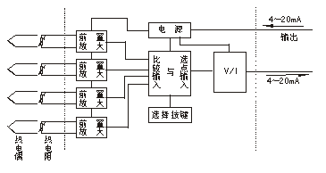 象附近,用屏蔽电缆将各回路的热电阻或热电偶传感器的测温信号连至该仪表各自独立的前置放大器,前置放大器将微弱变化信号放大处理,输送到比较输入电路(选择高温信号)或选点输入电路,进行信号选择。被选中的回路信号,再经过电压/电流转换单元处理,将前置放大器的输出电压转换成DC 4~20mA电流信号输出。如选择测温范围0~150℃则对应DC 4~20mA输出。