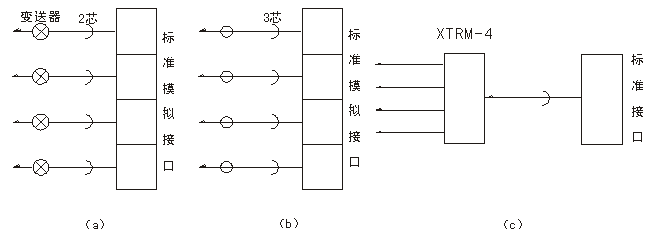 方案三:如图三(c)所示,四个热电阻传感器连接到现场XTRM仪表,再用一根二芯屏蔽电缆
