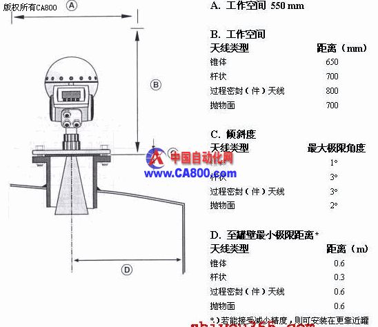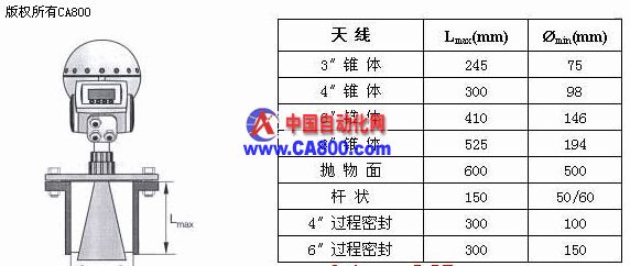 为了使微波能够不受干扰地传播,液位计管嘴的尺寸应保持在针对不同天线所规定的极限值内(见图3、表2)。
