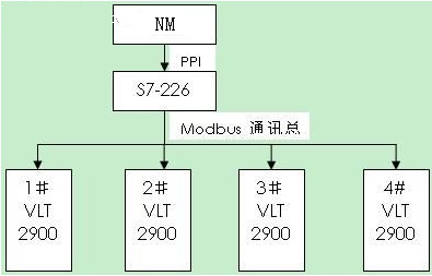 本方案中,触摸屏采用日本Proface公司生产GP系列,PLC采用西门子公司S7-226系列,变频器采用丹佛斯VLT2900系列,该系列变频器内已经内置了RS485接口且支持modbus协议,故这使该系统性价比非常高。S7-226系列CPU内置了两个通信口,这两个通信口都为RS485接口,均可三种方式下工作,即PPI方式、MPI方式及自由通信口方式。PPI是point-to-point缩写,即点对点方式,是西门子公司专为S7-200系列开发一个通信协议,本案中,我们可把其中一个通信口设置为该方式,连接HMI,进而做人机交换信息用。而第二个通信口我们把它设置成自由口通信方式。自由口通信方式是S7-200系列非常有特色功能。该方式下,依据和他通信其他设备公开通信协议来编程S7-200通信。我们本方案中用它连接变频器以实现它们之间相互通信。相关系统框图如下图所示:(基于本文阐述重点,其它如变频器和电机组成自反馈系统不再画出和赘述。)