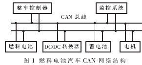 在电动汽车中,整车控制器通过CAN总线与电机、蓄电池等部件通讯,读取各部件的状态信息并向部件发送控制信息。图1为一种燃料电池汽车的CAN网络结构,整车控制器通过CAN网络采集燃料电池、DC/DC转换器、蓄电池和电机等部件状态参数,根据一定的控制策略向DC/DC转换器和电机发送控制命令,使动力系统各部件协调工作,实现整车的动力性和经济性指标。监控系统连接到CAN总线上,读取总线的数据帧,实现数据的采集和存储。