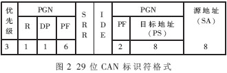 在CAN网络中数据以报文为单位进行传输,节点对总线的访问采取位仲裁方式。报文起始部分为标识符,在CAN2.0B中标识符采用29位格式,如图2所示。其中,优先级为3位,共8个优先级;8位PS为发送此报文的源地址,8位SA为目标地址,8位PF为报文代码。