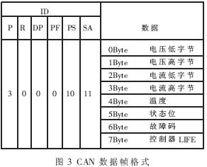图3为燃料电池汽车中燃料电池控制器向整车控制器发送的一个数据帧的格式。标识符ID为29位数据,根据标识符格式定义可以得出燃料电池地址为11,整车控制器地址为10,数据帧优先级为3。数据部分包含燃料电池输出电压、燃料电池输出电流、电堆温度、故障码、状态位和控制器LIFE信号等信息。
