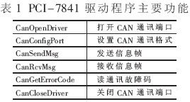 CAN总线监控系统软件采用虚拟仪器开发平台LabVIEW开发,仪器硬件部分包括便携式工控机和PCI总线CAN通讯接口卡。PCI-7841 CAN接口卡提供了动态链接库(DLL)形式的Windows2000/XP驱动程序,在LabVIEW中通过DLL调用实现第三方硬件的仪器驱动。PCI-7841提供的主要驱动程序功能如表1所示。