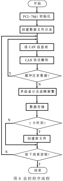 CAN总线监控程序流程如图6所示。首先进行硬件初始化,创建文件目录。读取CAN信息帧后按照协议进行解析,首先将数据帧分离成ID部分和数据部分,根据ID判断是哪一个部件的信息;然后根据协议中定义的参数起始字节和总字节数取出数据,经过偏移量和比例因子运算得出该
