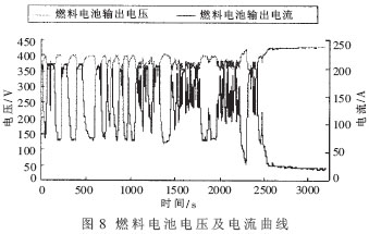 在燃料电池汽车道路考核试验中,应用车载CAN总线监控系统采集和记录整车CAN网络数据。图7为采集的车速曲线,图8为燃料电池电压电流曲线,其中车速数据来自于整车控制器,电压、电流数据来自于燃料电池发动机控制器。