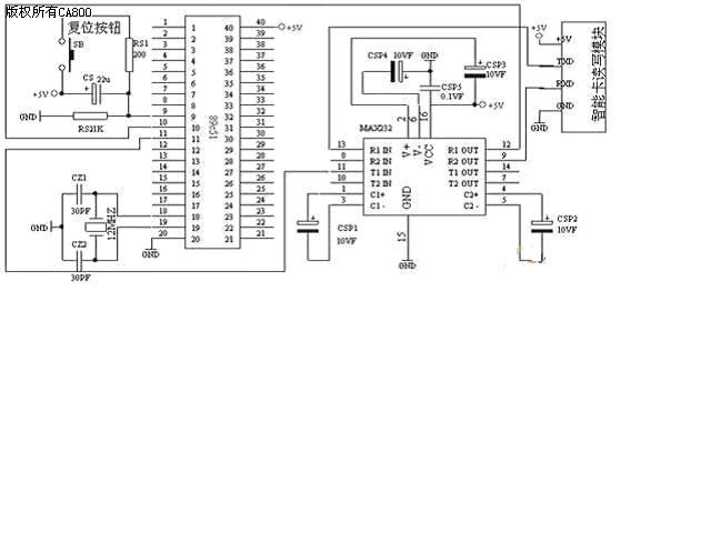 现在市场上已经有不少成熟的读写模块可供设计选用,通过比较智能卡读写模块选用MCS-RC500 V3.3 非接触式智能卡通用读写器。具体设计的硬件电路如图4所示。由于计算机技术的飞速发展,计算机接口技术也比较成熟,故市场上能够买到的读写模块都是基于计算机通信的读写设备。结合这个设计系统,现在必须做的工作是对该读写模块做二次开发。即利用串行异步通信技术把读写器模块和单片机接口,其中编写单片机接口汇编通信程序是本次开发的关键技术。