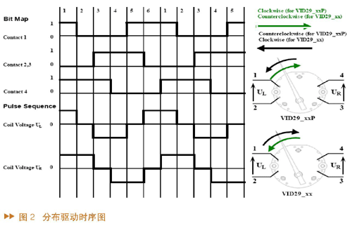 电机驱动模式有分步驱动模式和微步驱动模式。图2所示的是分步驱动的时序图,可以看到一个周期由六步组成,脉冲序列从左向右时,指针顺时针方向转动;反之,如果脉冲序列从右向左时指针逆时针方向转动。图3所示的是微步驱动模式时序图,其中蓝色线代表左线圈的电流,红色线代表右线圈的电流。一个周期共有24个微步组成,线圈上的电流波形近似于正弦波型。