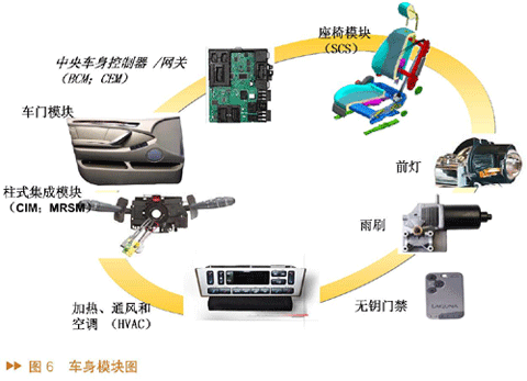 车身模块共包括八个部分:中央车身控制器/网关(BCM;CEM)、包括车门模块、柱式集成模块(CIM;MRSM)、加热、通风和空调(HVAC)、座椅模块(SCS)、前灯、雨刷以及无钥门禁。M16C系列车身平台有三个系列:32位的M32C架构模块、16位的M16C架构模块,还有8位的R8C架构模块。这些系列引脚兼容,软硬件兼容,外设兼容。瑞萨的车身低端MCU产品包括16位MCU,20至32MHz,20引脚 到100引脚。针对中国市场推广R8C/20/21/22/23; R8C/28/29;M16C/28/29。高/中端车身高MCU产品包括16/32位MCU, 1到4 个CAN。