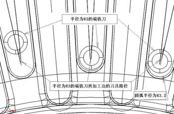 1 、在水平区域,采用半径较大的平头带小圆弧角的刀具进行加工。在垂直区域留下了与所用刀具半径圆弧相同的未加工区域。采用REMACHIN中的ONLY VERT . CONS . Z方法加工。如图1。最下侧的刀具路经a 。采用刀具半径为R10,刀尖角为R3