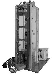 电梯模型由PLC、铝合金立柱、透明有机玻璃板、印刷电路面板等组成,整个模型安置在面积为30×22cm2的底板上,电梯部分固定在底板的前部,PLC固定在底板的后部,电梯与PLC通过排线连接,模型的总高度约为45cm,总重量约为4.5Kg,如图1所示。