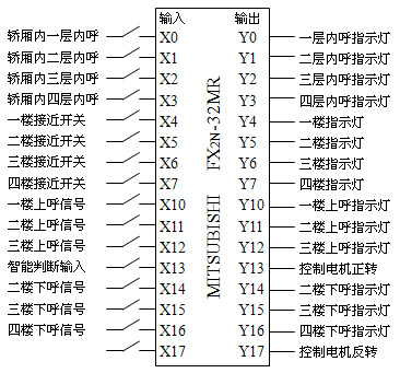 PLC选用三菱FX2N系列的FX2N-32MR,它有16输入点和16个输出点。PLC的输入信号有轿厢内呼梯、上呼梯、下呼梯、楼层接近开关共14个输入点;PLC的输出信号有指示灯、电机正转、电机反转共16个输出点,输入/输出点的地址分配情况如图2所示。