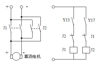 电梯的轿箱由一个5V直流电机拖动,并由PLC的Y13和Y17分别控制电梯轿箱的升降。尽管在PLC编程时,Y13与Y17进行互锁,但是为了防止意外而造成电源短路,在外部硬件上进行了互锁设计,即使用弹簧继电器J1和J2进行互锁,如图3所示,从而避免发生电源短路事故。具体实现过程:输出点Y13闭合,继电器J1线圈得电,使5V直流电源正接到直流电机上,此时直流电机正向转动,即电梯轿箱上升;输出点Y17闭合,继电器J2的线圈得电,使5V直流电源反接到直流电机上,此时直流电机反向转动,即电梯轿箱下降。