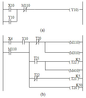 图4(b)是 “一楼上呼信号X10”的响应处理。当轿厢到达一层时,一楼接近开关动作,使X4接通,进一步使得M110动作并自锁,导致图4(a)中Y10断开, “一楼上呼指示灯”灭,即“一楼上呼信号”被响应。通过三个定时器(T20、T21和T22)实现楼层指示灯闪烁5s,其中M310间接地使电机停转,M410用于实现“一楼指示灯”闪烁控制。