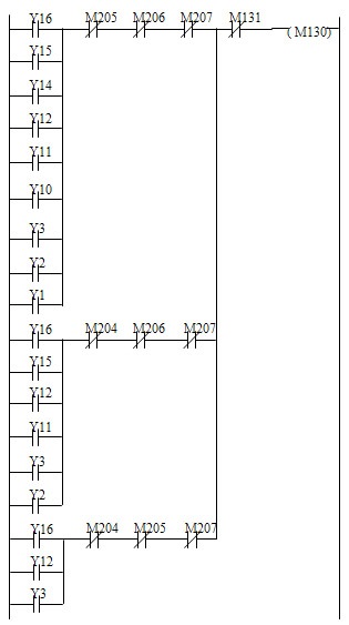 当轿厢在一楼位置,M204通电,M205、M206和M207断电,此时轿厢外呼梯信号X16、X15、X14、X12、X11、X10以及轿厢内呼梯信号X3、X2、X1都有可能产生上升运行状态;相似地,当轿厢在二楼位置,M205通电,M204、M206和M207断电,此时轿厢外呼梯信号X16、X15、X12、X11以及轿厢内呼梯信号X3、X2都有可能产生上升运行状态;当轿厢在三楼位置,M206通电,M204、M205和M207断电,此时轿厢外呼梯信号X16、X12以及轿厢内呼梯信号X3都有可能产生上升运行状态。如图5所示,输出点Y均被自锁,所以一旦产生上升运行状态(M130通电),那么只有当所有上楼呼梯信号被响应后,才能解除上升运行状态(M130断电)。