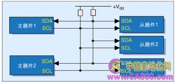 I2C是一个半双工、多主总线,该总线网络有一个或几个主控器件和很多个从器件。信息由两条串行线传输:串行数据线(SDA)和串行时钟线(SCL)。图1显示了使用两个主控和三个从器件相连接的例子。