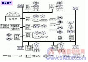 车的上层主干网络,而在不需要CAN的高速与多功能性的场合则由LIN来构成下层局部网络,实现分级制网络结构,以达到合理分配利用网络资源、提高线路布置的方便灵活性、降低成本的目的。典型的基于CAN-LIN总线的分级制汽车车身网络如图4所示。