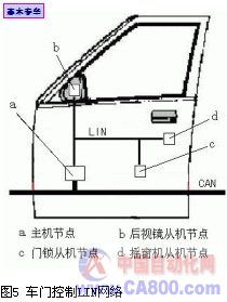 车门控制LIN网络的结构及其在车门上的布置如图5所示,该网络由主机节点、后视镜从机节点、摇窗机从机节点、门锁从机节点构成。
