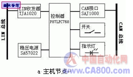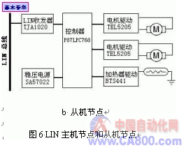 图6为车门控制LIN网络的主机节点和后视镜从机节点的结构框图图。主机节点主要由控制器、电源、控制按钮、LIN接口、CAN接口和指示灯几部分组成。后视镜从机节点主要由控制器、电源、LIN接口、执行器驱动单元和执行器如后视镜调整电机、除霜加热器等组成。