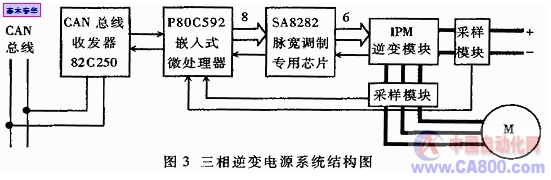 本文介绍的电动车用三相逆变电源属于图1中的车载辅助逆变电源。称为“辅助电源”是因为它的负载为电动车上的一些辅助交流电机,如汽车转向助力油泵、刹车气泵、冷却水循环中的水泵以及空调系统中的压缩机等。对该三相逆变电源的工作要求是:正常运行情况时独立维持辅助电机的稳定运行,能够根据上位机的指令适当调整工作状态;在负载发生故障(如电机短路)时迅速关系输出、安全关机,同时能够通过CAN总线向上位机和其它节点报告自身故障,引发车辆各系统的相关操作(例如:位于仪表台上的人机界面显示系统将立即显示警告信息,报告车辆故障部位,并提示驾驶员减速;而整车能量管理系统则发出命令关闭辅助逆变电源的输入,并将接收到的错误代码和当前运行参数进行保存,便于维修人员进行故障诊断)。